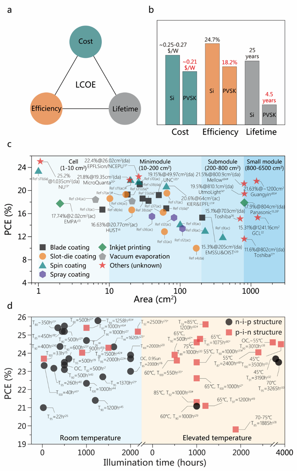 Perovskite photovoltaic devices are undergoing rapid development and have reached a certified power conversion efficiency of 26.1% at the cell level. Tremendous efforts in material and device engineering have also increased moisture, heat, and light-related stability. Moreover, the solution-process nature makes the fabrication process of perovskite photovoltaic devices feasible and compatible with ...