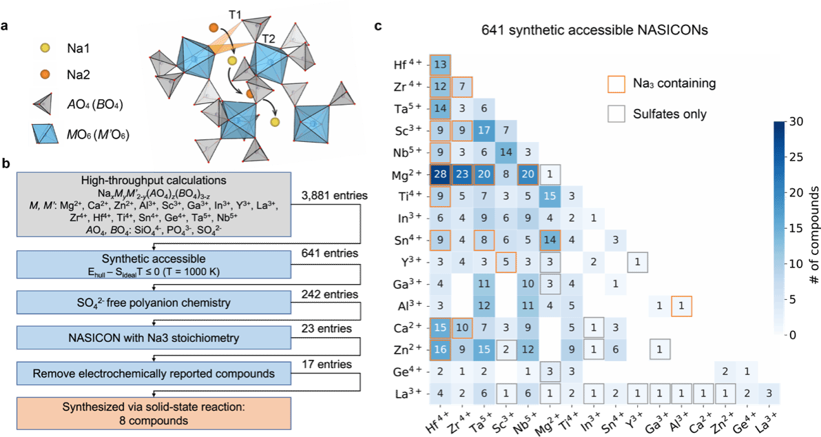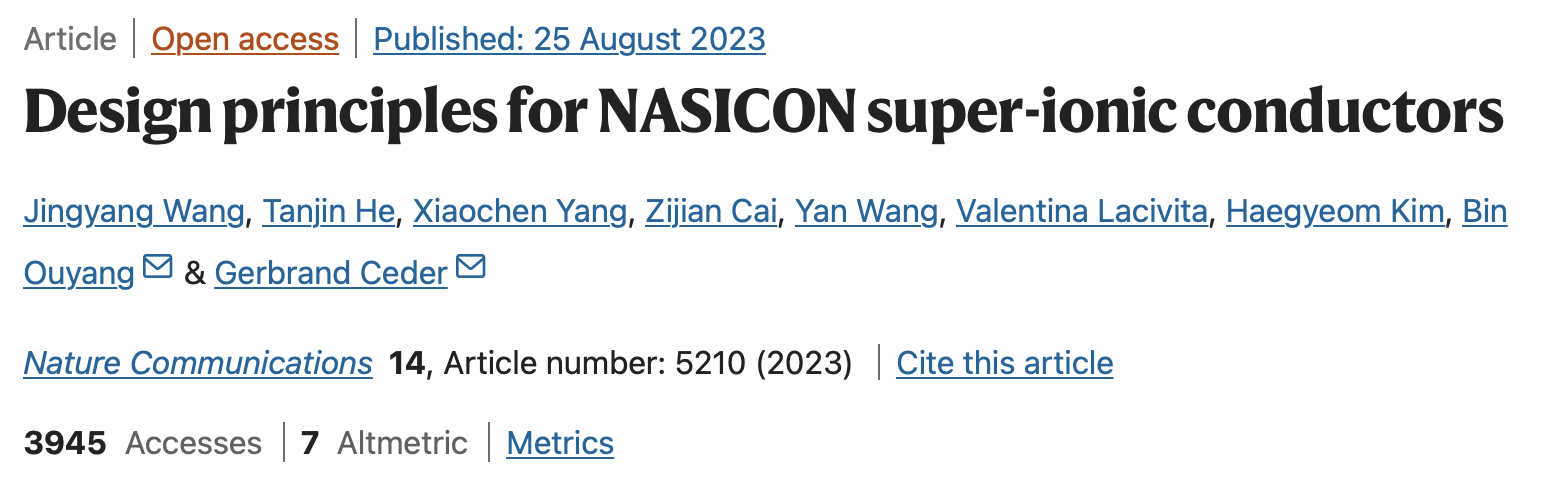 Jingyang Wang, Tanjin He, Xiaochen Yang, Zijian Cai, Yan Wang, Valentina Lacivita, Haegyeom Kim, Bin Ouyang*, Gerbrand Ceder*. Design principles for NASICON super-ionic conductors. Nature Communications. (2023) 14:5210 (https://doi.org/10.1038/s41467-023-40669-0)