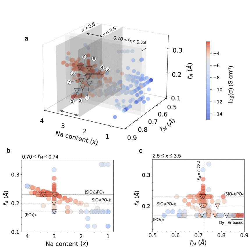 Na Super Ionic Conductor (NASICON) materials are an important class of solid-state electrolytes owing to their high ionic conductivity and superior chemical and electrochemical stability. In this paper, we combine first-principles calculations, experimental synthesis and testing, and natural language-driven text-mined historical data on NASICON ionic conductivity to achieve clear insights into how chemical composition influences the Na-ion conductivity. These insights, together with a high-throughput first-principles analysis of the compositional space over which NASICONs are expected to be stable, lead to the successful synthesis and electrochemical investigation of several new NASICONs solid-state conductors. Among these, a high ionic conductivity of 1.2 mS cm−1 could be achieved at 25 °C. We find that the ionic conductivity increases with average metal size up to a certain value and that the substitution of PO4 polyanions by SiO4 also enhances the ionic conductivity. While optimal ionic conductivity is found near a Na content of 3 per formula unit, the exact optimum depends on other compositional variables. Surprisingly, the Na content enhances the ionic conductivity mostly through its effect on the activation barrier, rather than through the carrier concentration. These deconvoluted design criteria may provide guidelines for the design of optimized NASICON conductors.