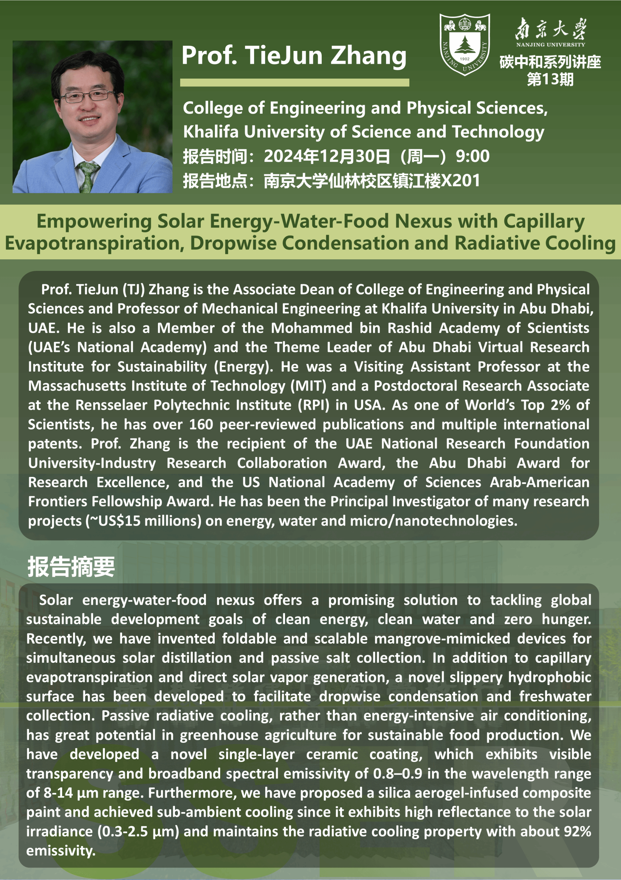 太阳成集团122ccvip碳中和系列讲座第13期——Prof. TieJun Zhang