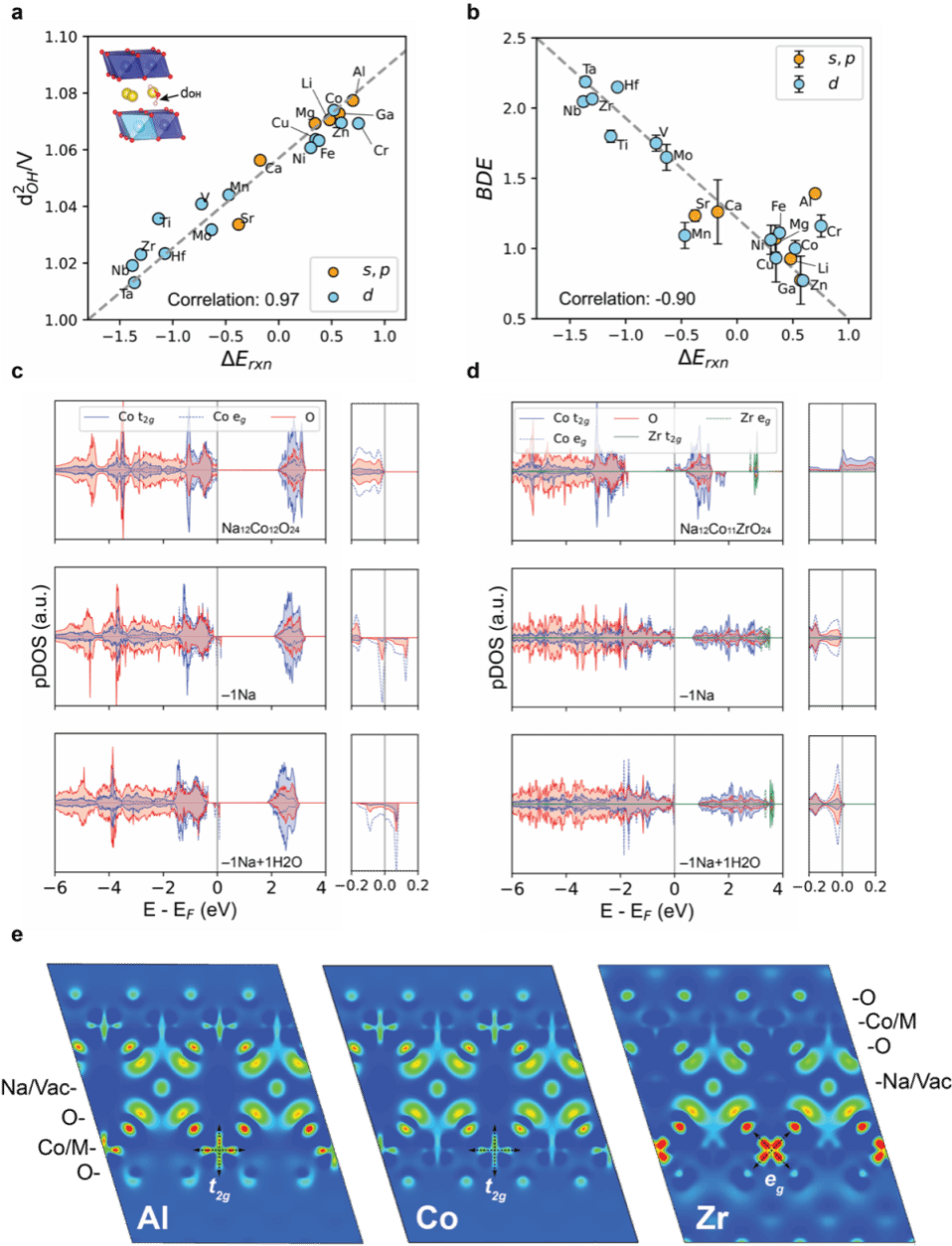作者首先通过第一性原理计算,深入研究了O3型钠离子电池正极的空气失效的反应机理,提出由水分子、氧气、二氧化碳参与的协同反应在热力学上具有最低的反应能,并且该反应能与材料的化学组分密切相关。针对这种相关性,作者进一步提出了d2OH/V和bond dissociation energy(BDE)两种对材料空气稳定有预测能力的特征描述符,其线性相关系数分别达到了0.97和–0.90,实现了对材料空气稳定性的快速预测。同时,作者通过对材料电子结构变化进行深入研究,揭示了不同化学组分对材料空气稳定性影响的本质原因。