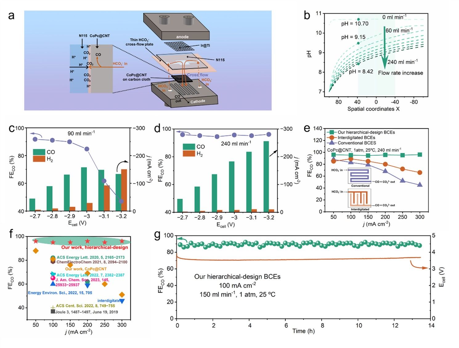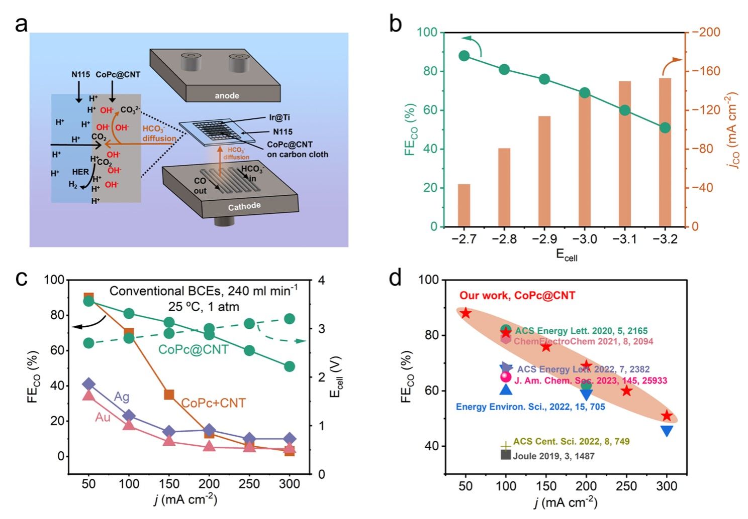 作者发现在传统碳酸氢盐电解槽中,催化剂对于低浓度CO2的吸附能力不强,电化学还原原位产生的OH-也会阻碍CO2向催化剂表面的传质,最终导致催化剂表面吸附活化的CO2数量不充足,只能依靠分解水实现在大电流下的工作,是大电流下FE较低的主要原因。在该工作中,作者采用了一种分层级设计策略,在分子水平上选用了具有更强CO2吸附能力的单原子催化剂 CoPc@CNT,在系统水平上,通过阴极电解质穿梭流动策略进一步促进了CO2的传质,通过两种方法的结合,有效提升促进了CO2在催化剂表面的吸附活化,从而大幅提升了大电流下碳酸氢盐电解槽的FE。