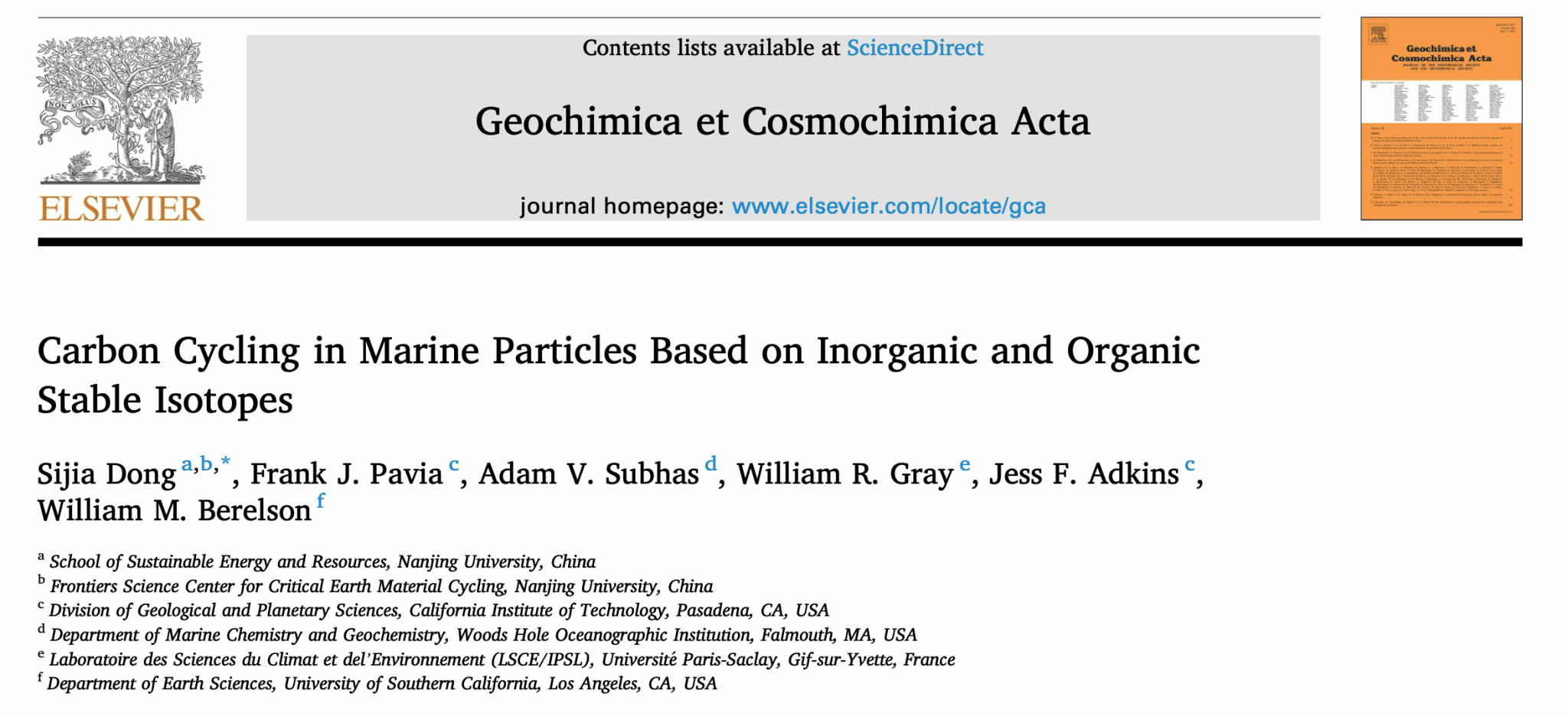 论文信息:Sijia Dong *, Frank J. Pavia, Adam V. Subhas, William R. Gray, Jess F. Adkins, William M. Berelson. Carbon Cycling in Marine Particles Based on Inorganic and Organic Stable Isotopes, Geochimica et Cosmochimica Acta,2024, ISSN 0016-7037,