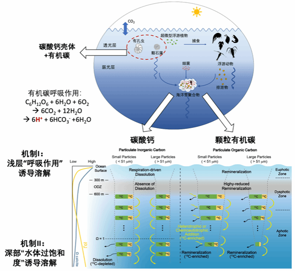 在数据测量的基础上,研究者进一步构建了针对海洋颗粒中碳浓度和同位素含量的箱式模型,以确定并量化海洋颗粒中的生物地球化学过程(图2)。结合不同深度水体溶解氧含量、碳酸钙过饱和度这两个环境条件(图1a,d),研究结果显示,碳酸钙过饱和水体中的溶解氧对有机碳呼吸作用及其诱导的碳酸钙溶解发挥了关键作用。在氧气充足的浅海,有机碳分解可以诱导碳酸钙在过饱和的水体中发生溶解,但是在缺氧区由于有机碳无法分解,呼吸作用受到抑制,碳酸钙也同步被保存。据此研究者提出,在浅海高有机碳-高氧气含量条件、深海低碳酸钙过饱和度条件下,“呼吸作用诱导”和“水体过饱和度诱导”两种不同碳酸钙溶解机制同时存在(图3)。此外,研究者评估了有孔虫(方解石)、颗石藻(方解石)、翼足类(文石)等不同生物成因碳酸钙在两种溶解模式中的贡献。饱和深度以下的水体中,由于颗石藻较有孔虫密度较小、沉降速率较慢,过饱和度驱动的碳酸钙溶解以颗石藻溶解为主,而由于颗石藻和有孔虫在碳同位素分馏中的不同生命效应,导致海洋颗粒物中的总体碳酸钙13C随深度加深逐渐变化。在浅层水体的透光区中,因为呼吸作用诱导的碳酸钙溶解对于不同粒径的生物碳酸钙壳体不存在差异,故颗粒中的同位素成分随着深度加深没有明显变化。对于有机碳的13C,有机碳的再矿化作用移除了富13C的部分,并且由于>51μm的大粒径颗粒在海洋水体中的浓度远低于0.5-51μm小粒径颗粒,再矿化作用对于大粒径颗粒的13C影响更加显著。同时,由于富13C的异养或化能自养微生物吸附小粒径颗粒,导致小粒径颗粒的13C随深度的变化趋近于零。