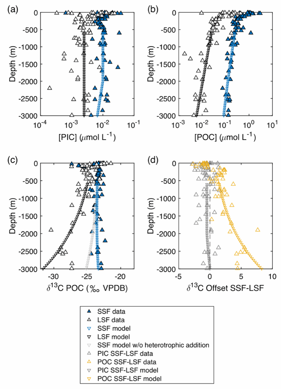 图2 深部水体中,通过箱式模型模拟的浓度和同位素随水深的变化(小倒三角符号)与观测结果(大正三角符号)的对比,模型涵盖的生物地球化学过程包括,水体过饱和度驱动的碳酸钙溶解(贫13C)、有机碳再矿化作用(富13C)、异养或化学自养微生物对小型颗粒的附着(富13C)