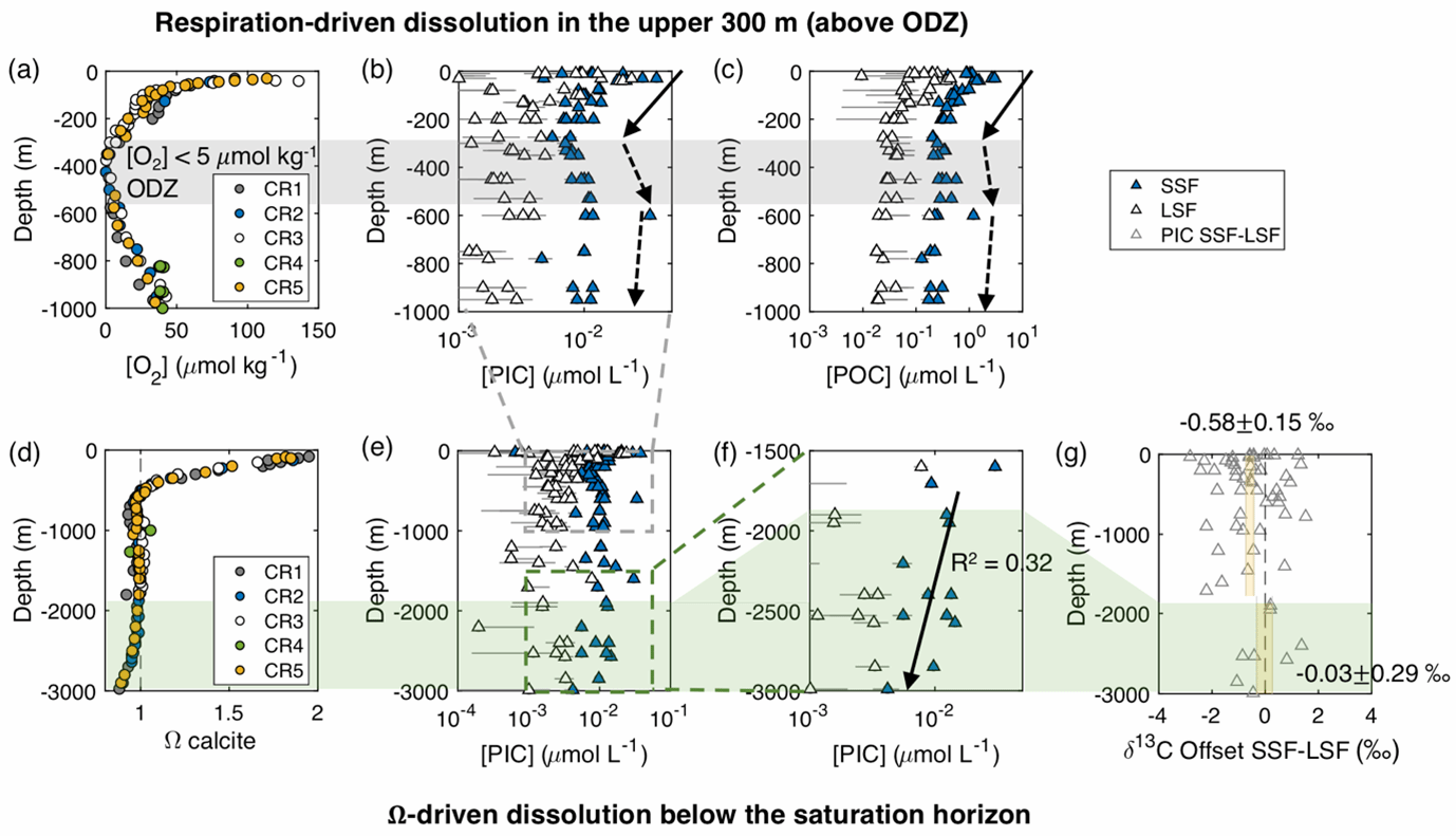 本项研究通过测量海洋溶解无机碳(DIC)、以及不同海雪颗粒中的颗粒有机和无机碳(POC,PIC)中的稳定碳同位素,为海洋水体中的多种生物地球化学过程,尤其是海雪颗粒中的碳酸钙溶解过程提供了新的同位素证据。